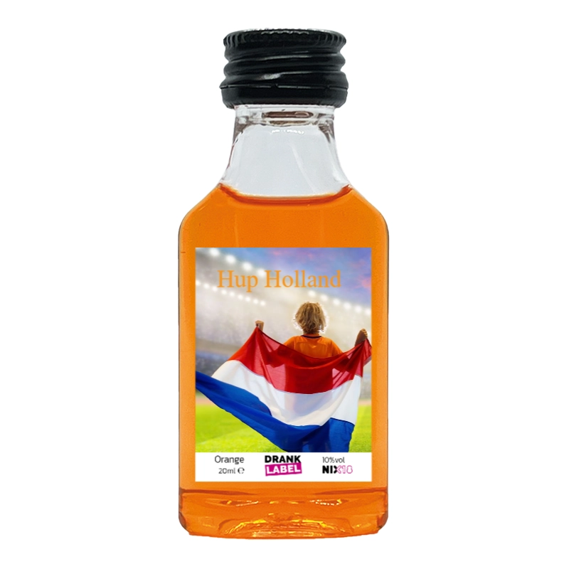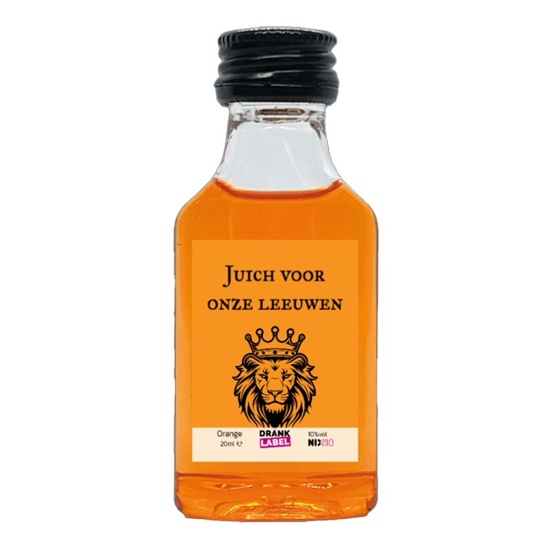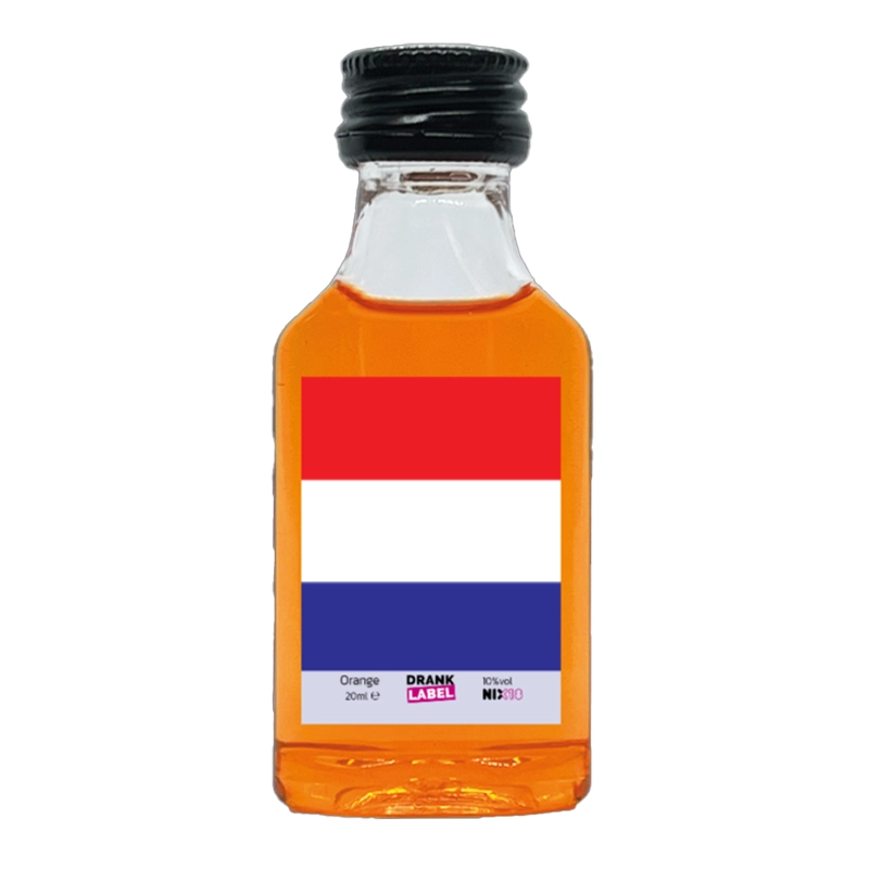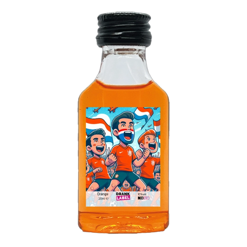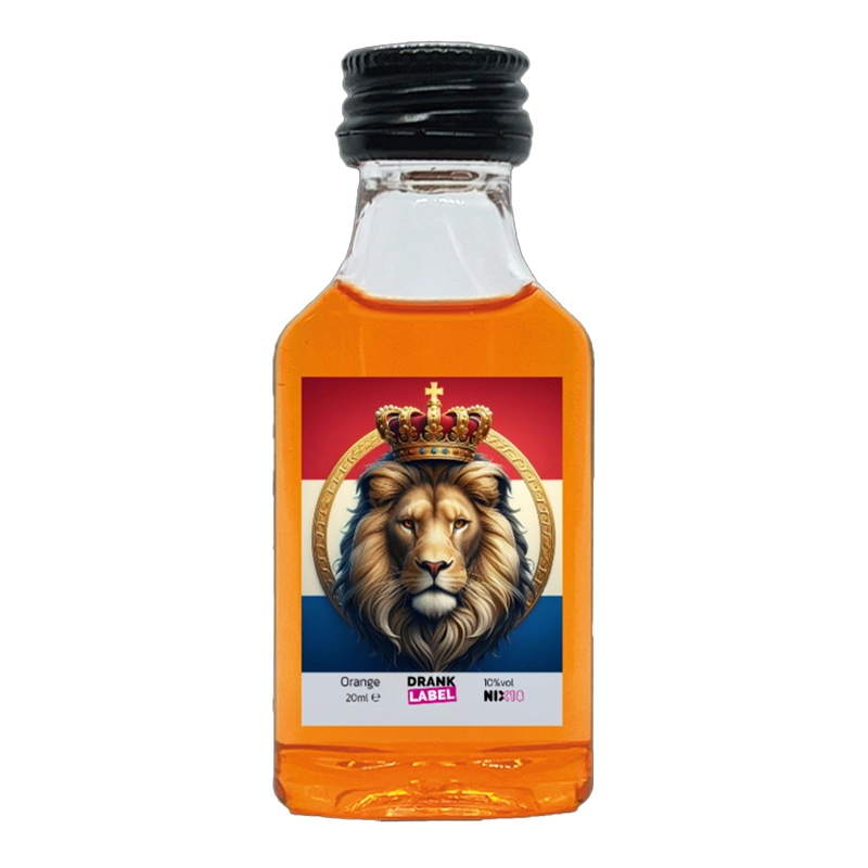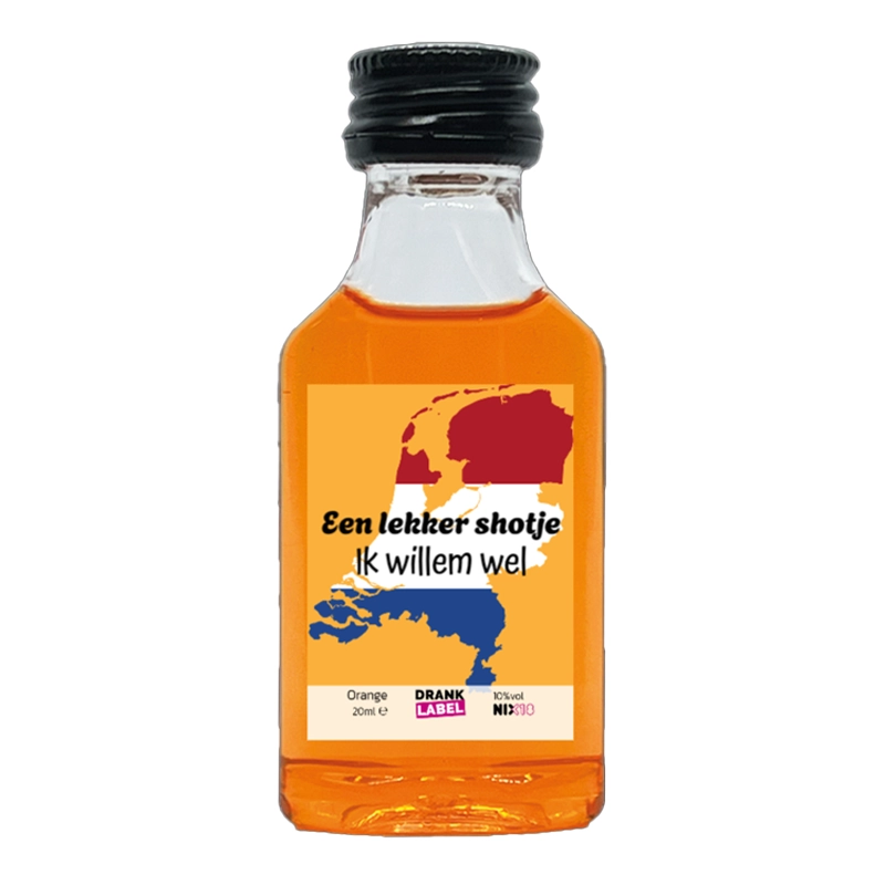Het oranje shotje heeft de smaak orange. Een oranje shotje met sinaasappelsmaak is een leuke sfeermaker tijdens Koningsdag of als het Nederlands elftal een WK of EK speelt. Een oranje shotje met etiket is bij DrankLabel al mogelijk vanaf 40 stuks. Je ontwerpt de shotjes eenvoudig via de ontwerpmodule waar je foto’s, teksten en templates kan toevoegen aan je eigen design. Oranje shotjes bedrukken bij DrankLabel is eenvoudig en we verzenden de shotjes binnen vijf werkdagen.