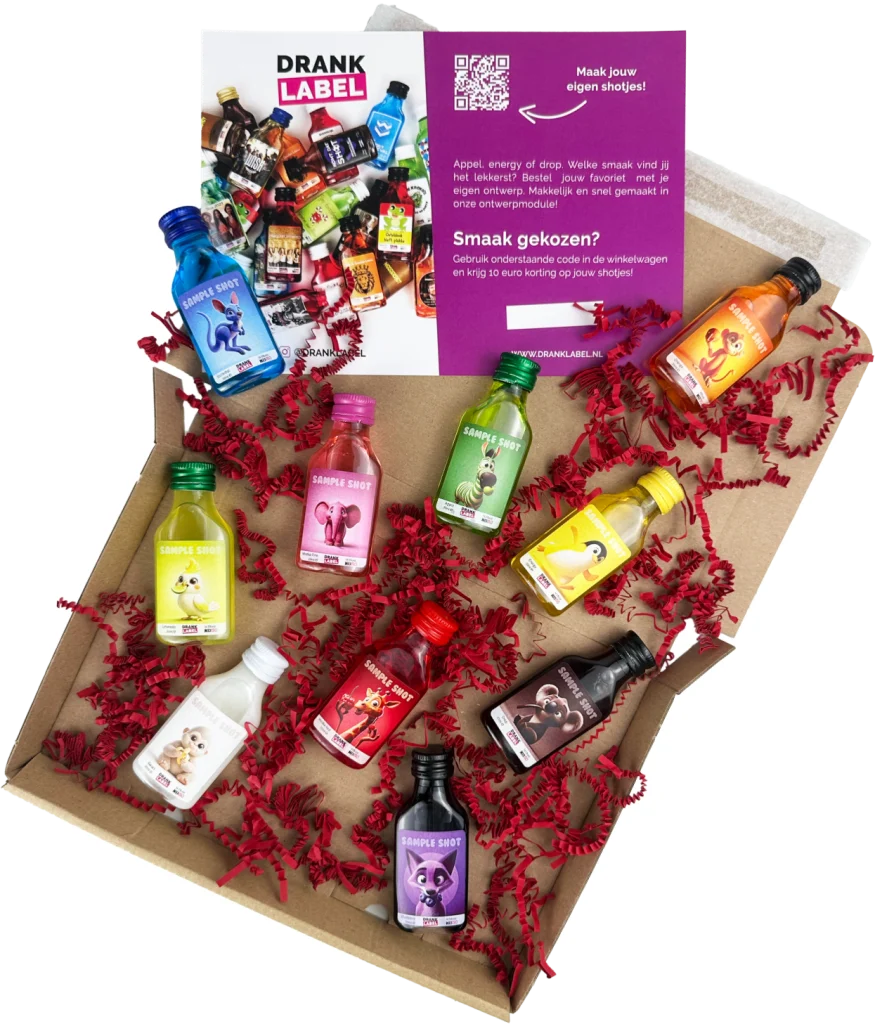 Ben jij op zoek naar een shotje met je eigen logo, foto of tekst? Bij Dranklabel ontwerp je jouw eigen shotje helemaal naar wens. Maak een keuze uit de smaken Stuiterbal, Blueberry, Energy, Apple, Orange, Wodka Red, Wodka Pink, Banaan Vanille, Limoncello, Drop en Lemon Ginger Kick en begin met het ontwerpen van je eigen shotje! Leuk als bedankje voor op je bruiloft of om uit te delen tijdens een vrijgezellenfeest, carnaval, Koningsdag of verjaardagsfeest, maar ook voor kroegen, festivals, bedrijfsfeesten en verenigingen maken wij shotjes met etiket. Het maken van je eigen shotje was nog nooit zo eenvoudig!